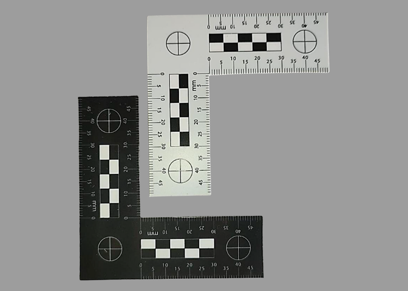 Escala de evidencia fotográfica en vinilo doble cara negro y blanco, para toma de fotografías con testigo métrico en lofoscopia.